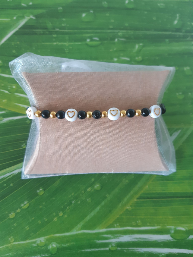 Liebevolle Akzente für dein Handgelenk! ❤️ Dieses charmante Armband kombiniert ein zartes, weißes Band mit einer Reihe von eleganten Perlen. Schwarze und goldene Perlen wechseln sich ab und werden durch weiße Perlen mit einem kleinen, goldenen Herzakzent ergänzt. Die goldenen Herzen verleihen dem Armband eine romantische Note. Durch den praktischen Schiebeknoten lässt sich die Größe des Armbands einfach verstellen. Ein liebevolles Accessoire, das sich wunderbar als Geschenk eignet oder dir selbst eine Freude bereitet. Zeige deine Zuneigung im Detail!