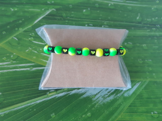 Dieses farbenfrohe Armband bringt gute Laune ans Handgelenk! Die runden Farbverlauf-Perlen in Gelb und Grün harmonieren perfekt mit den schwarzen Würfelperlen, die mit schimmernden Herzsymbolen verziert sind. Das Armband ist größenverstellbar und wird mit einer schwarzen Satinkordel geknüpft - angenehm weich und flexibel. Ideal als kleines Geschenk oder um selbst ein Statement zu setzen!