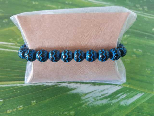 Dieses elegante Armband besteht aus einem leuchtend blauen Band, das mit tiefblauen Perlen verziert ist. Die Perlen weisen ein feines, geheimnisvolles Muster auf, das einen faszinierenden Kontrast zum helleren Blau des Bandes bildet. An den Enden des Zugbandes befinden sich zarte, durchsichtige Perlen in Sternform, die einen verspielten Akzent setzen. Dank des praktischen Schiebeknotens lässt sich die Größe des Armbands individuell anpassen. Ein stilvolles Accessoire, das deinem Look eine geheimnisvolle Note verleiht. Tauche ein in tiefblaue Eleganz!