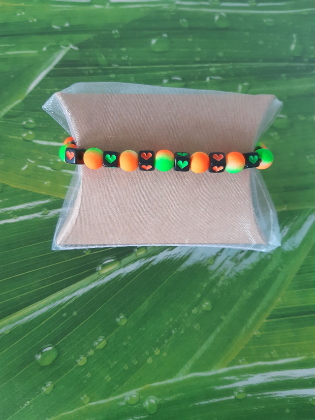 Dieses farbenfrohe Armband bringt gute Laune ans Handgelenk! Die runden Farbverlauf-Perlen in Grün und Orange harmonieren perfekt mit den schwarzen Würfelperlen, die mit schimmernden Herzsymbolen verziert sind. Das Armband ist größenverstellbar und wird mit einer schwarzen Satinkordel geknüpft - angenehm weich und flexibel. Ideal als kleines Geschenk oder um selbst ein Statement zu setzen!